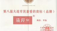 通過市工商局和國家統(tǒng)計(jì)局大連調(diào)查隊(duì)合作,以及《大連日報(bào)》、《大連晚報(bào)》、《新商報(bào)》等媒體合作,經(jīng)過一個(gè)月的調(diào)查統(tǒng)計(jì)工作,最終大連“曉芹”商標(biāo)(品牌)獲得大連市政府頒發(fā)的“市民喜愛的商標(biāo)”稱號(hào)證書、牌匾。