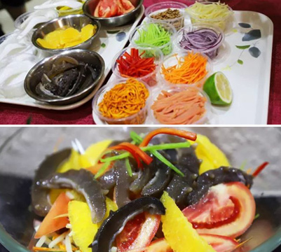 食材:曉芹水發(fā)海參、瘦肉、火腿、蟲草花、竹筍、黃瓜、胡蘿卜、豆芽、橙子、青檸、西紅柿、洋蔥、豆芽、姜絲
